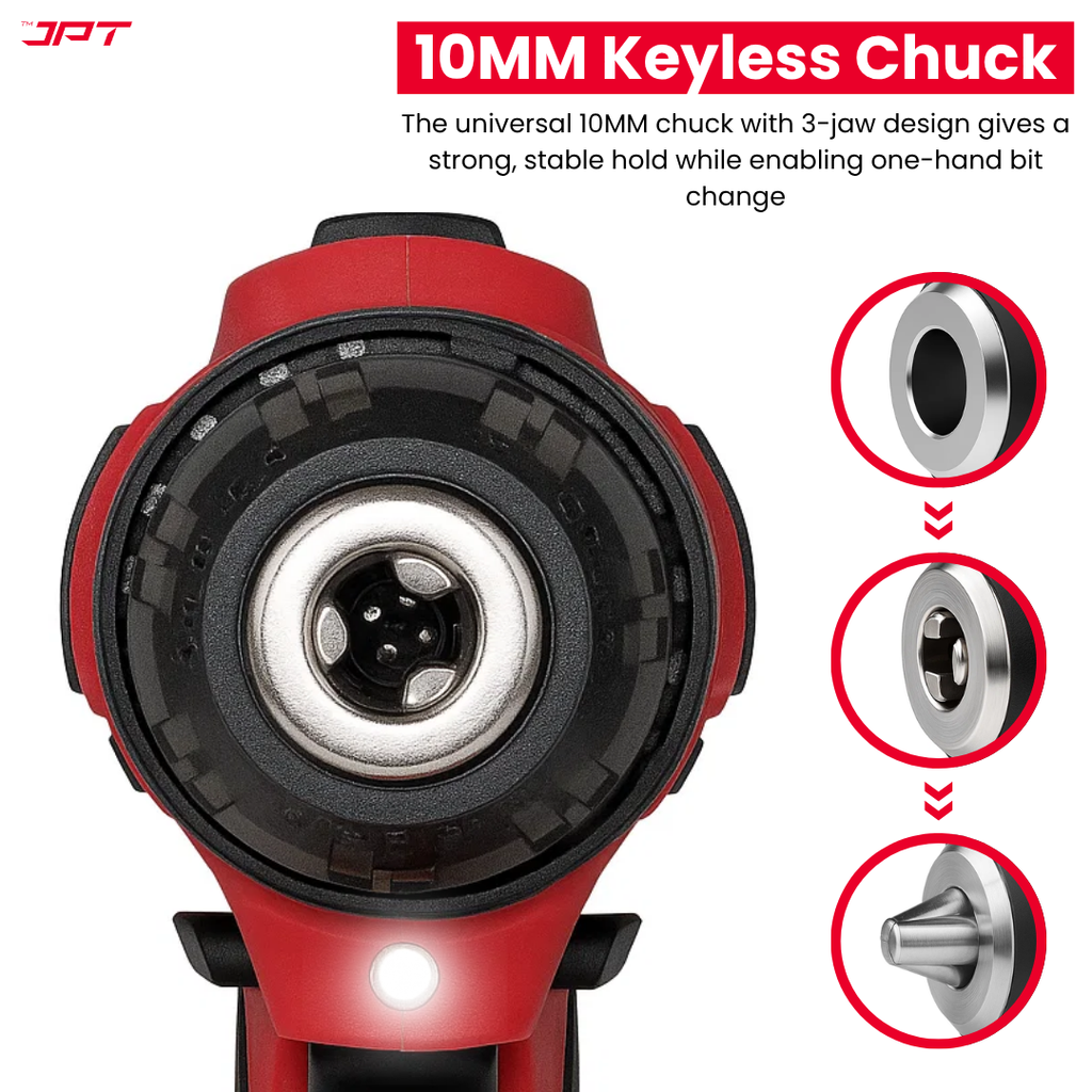 With a universal 10mm keyless chuck featuring a 3-jaw locking design for stable grip and quick one-hand bit changes.