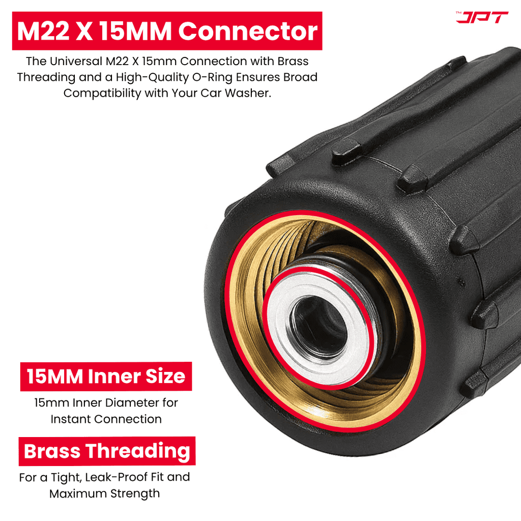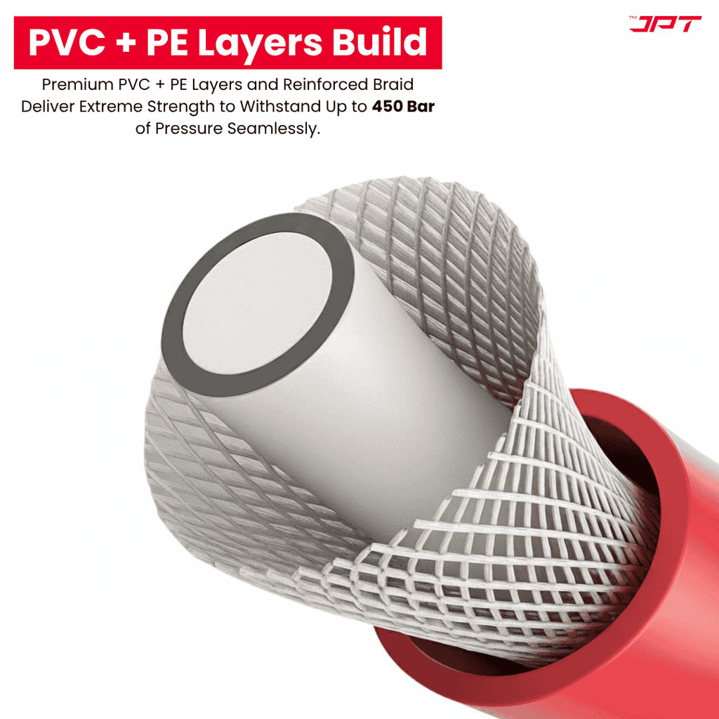 This JPT ultra heavy-duty hose pipe build from premium PVC + PE layers and reinforced braid, it withstands up to 450 Bar (6525 PSI) of pressure without leaks or deformation. Its M22 x 15mm brass-thread connectors ensure a tight, secure fit with most standard washers.